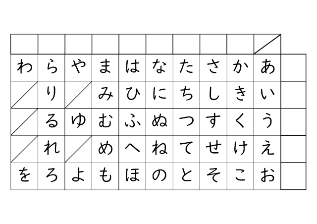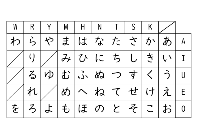 五十音表の行と段にアルファベットを埋めてローマ字表を完成させましょう。訓令式は音と文字の対応が厳密なので、学習ストレスが少ないと思います。当然ですが、ひらがなの五十音表を覚えていることが前提です。